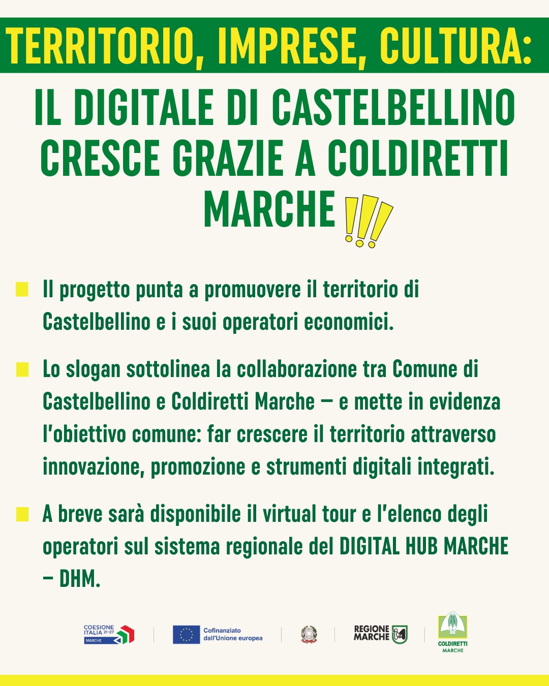 Il progetto punta a promuovere il territorio di Castelbellino e i suoi operatori economici. Lo slogan sottolinea la collaborazione tra Comune di Castelbellino e Coldiretti Ancona— e mette in evidenza l’obiettivo comune: far crescere il territorio attraverso innovazione, promozione e strumenti digitali integrati. A breve sarà disponibile il virtuale tour e l’elenco degli operatori sul sistema regionale del DIGITAL HUB MARCHE – DHM.